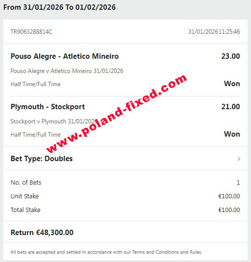 | 31.01.2026 | Stockport – Plymouth | 2-1 | 21.00 | HT 0:1 FT 2:1 |