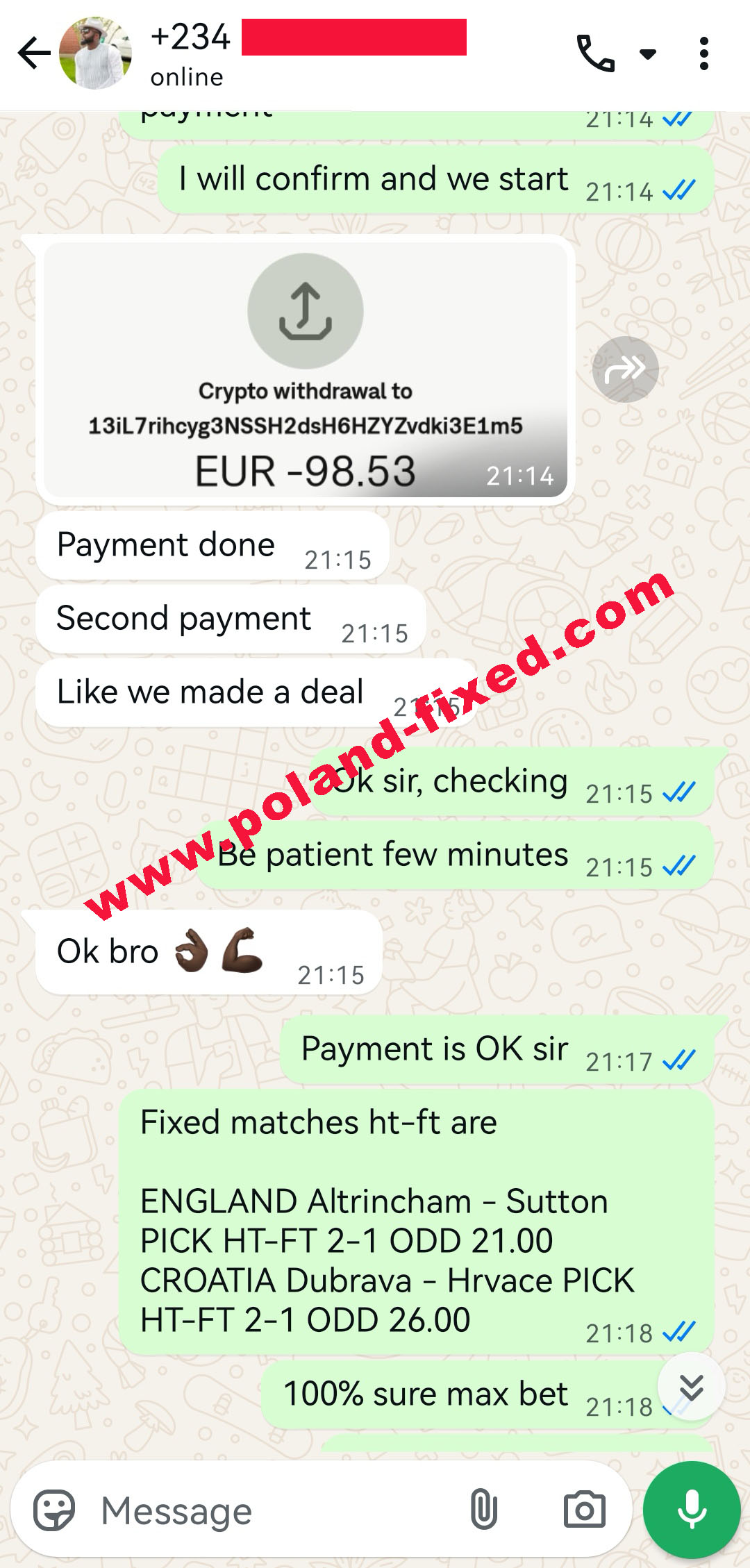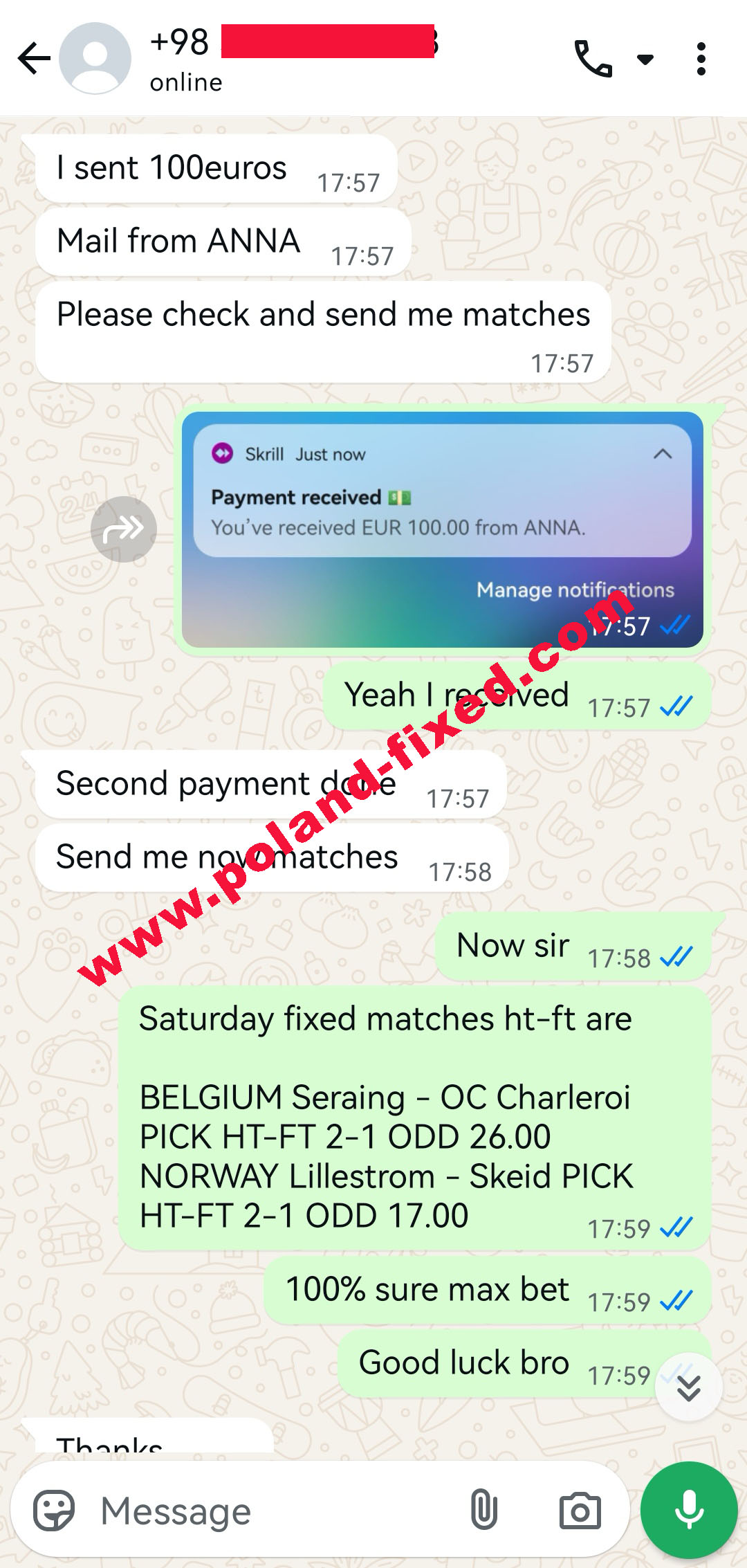 IMPORTANT: Dont send mesages for free fixed matches or payment after win, all e-mail will be rejected. Payment for 100% sure fixed matches is before the matches!